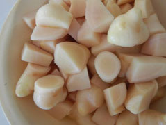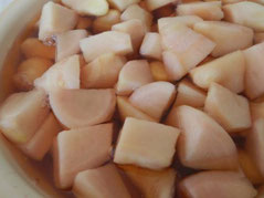 大きめに切って、甘酢漬けにします。酢につけるとほんのり桜色に染まり、梅雨から夏にかけて爽やかな味わいを楽しむことができます。