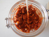 ② 1か月もすると唐辛子は柔らかくなるので、使う量だけ取り出して塩一つまみを加え、ブレンダーかミキサーにかける。