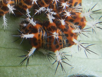 無事にサナギになって無事に成虫になれますように。その芸術的なトゲトゲを生かして、しっかり生き延びてほしいものです。このいかにも危険そうなトゲトゲ、見かけ倒しで毒はないそうです。